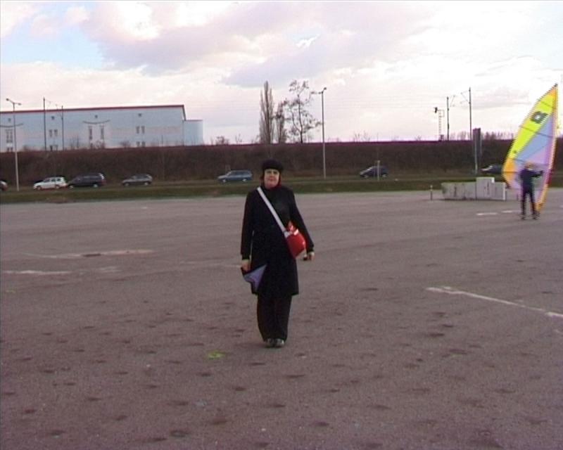 Auf kleine Zettel sind für die Person und für die Kamera Positionen aufgeschrieben – wie auf einem Schachbrett . Nach dem Zufallsprinzip die Positionen und so die Standpunkte von Person und Kamera zueinander gezogen. Die Kamera ist immer auf die Person gerichtet, die Person schaut immer in die Kamera. Ringsherum finden Bewegungen statt: Passanten, Autos, Züge, Skateboarder, Radfahrer, Fußgänger… In der Ausstellungssituation werden die beiden Filme als Endlosschleifen auf zwei verschiedenen Monitoren gezeigt, die nicht gleichzeitig sichtbar sind.