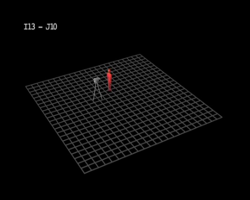 Monitor 1 nimmt eine Metaposition ein aus einem abstrakten, digitalen Raum heraus als Computeranimation. Es ist so etwas wie eine „gedankliche Vogelperspektive“, die Vorstellung der Konstellation und der Distanz zwischen Person und Kamera. Die Koordinatenpunkte (G12 / B4, usw.) zeigen die jeweiligen Positionen an. Monitor 2 zeigt den „subjektiven“, „realen“ Blick der Kamera mit dem originalen Filmmaterial, das vor Ort aufgenommen wurde.